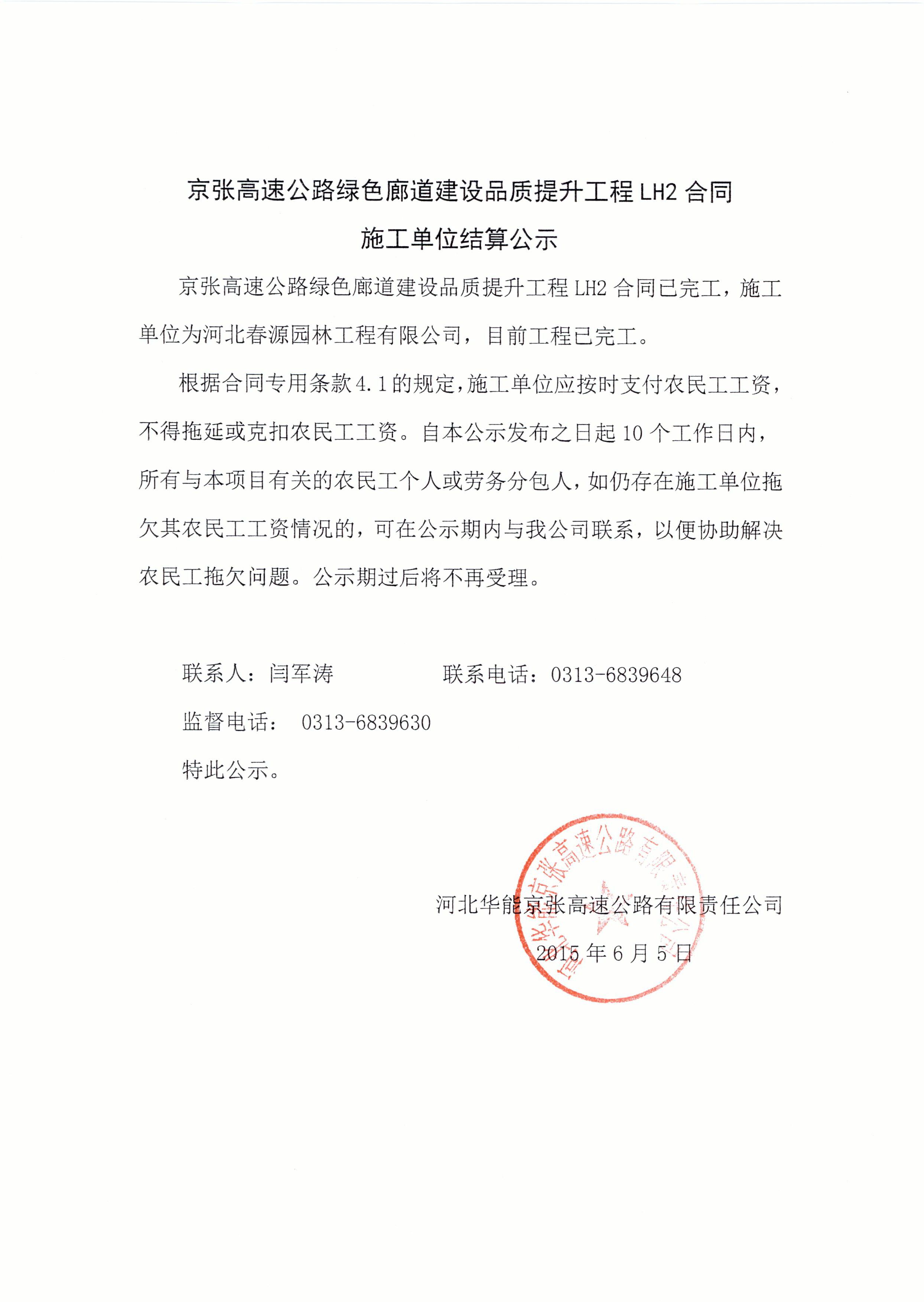 京張高速綠色廊道綠化二標(biāo)結(jié)算公示