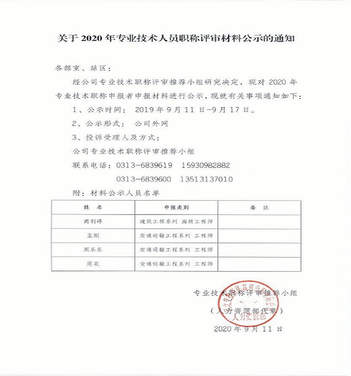 關(guān)于2020年專業(yè)技術(shù)人員職稱評審材料公示的通知