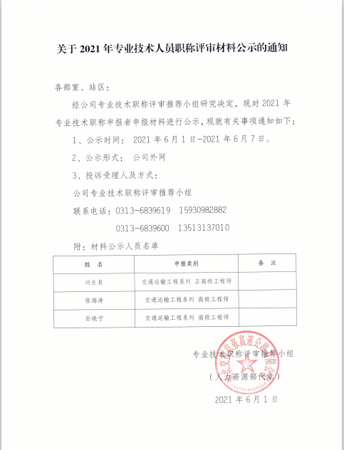 關于2021年專業(yè)技術人員職稱評審材料公示的通知