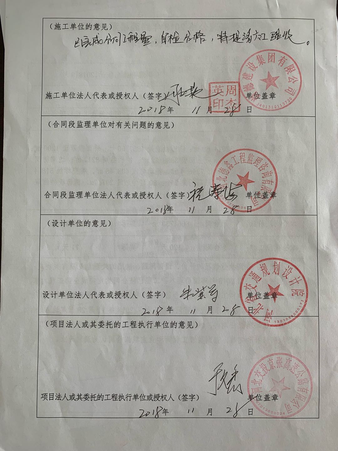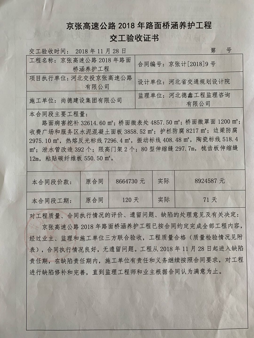 京張高速公路2018年路面橋涵養(yǎng)護(hù)工程交工驗收證書
