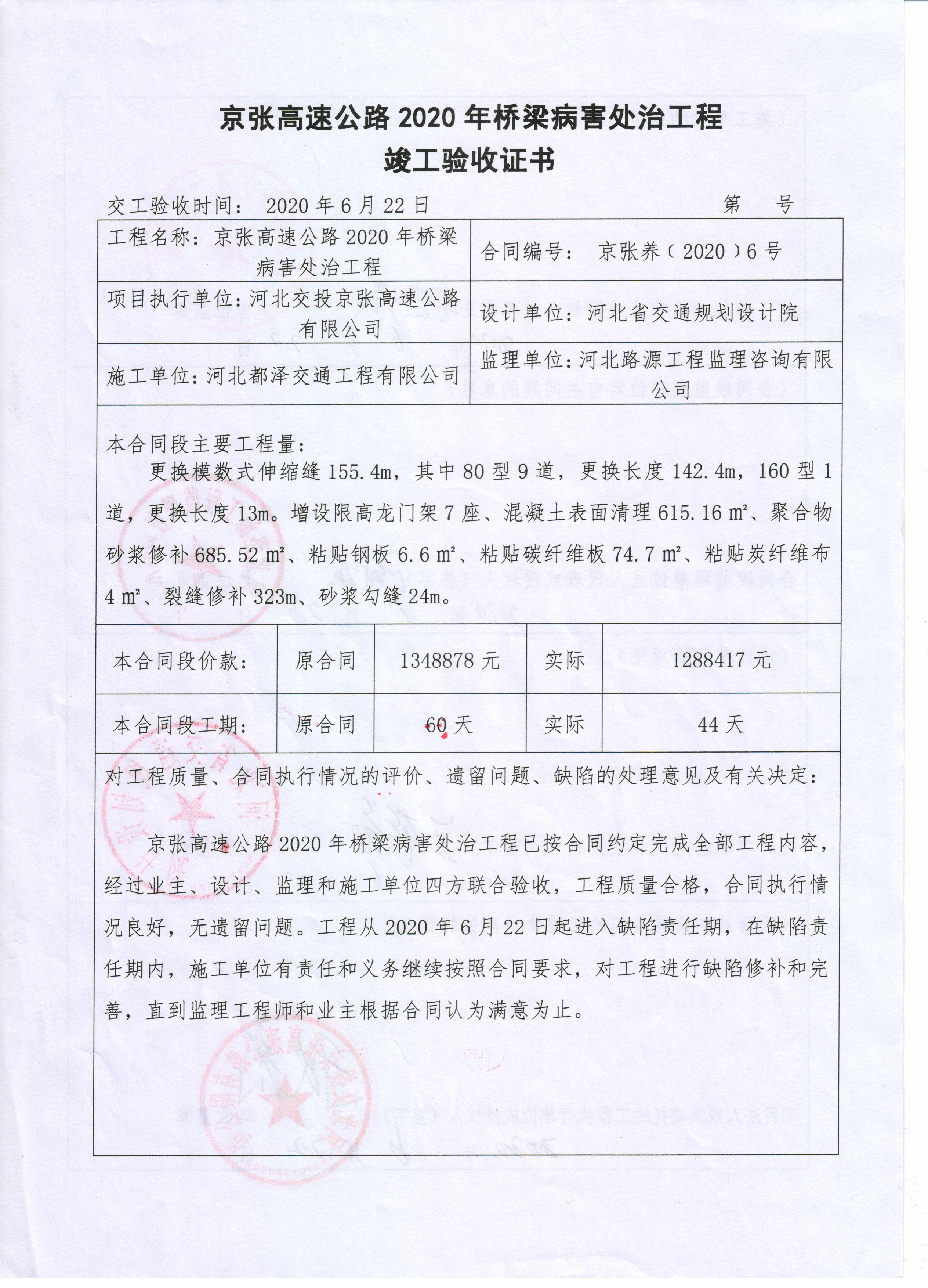京張高速公路2020年橋梁病害處治工程竣工驗(yàn)收證書(shū)