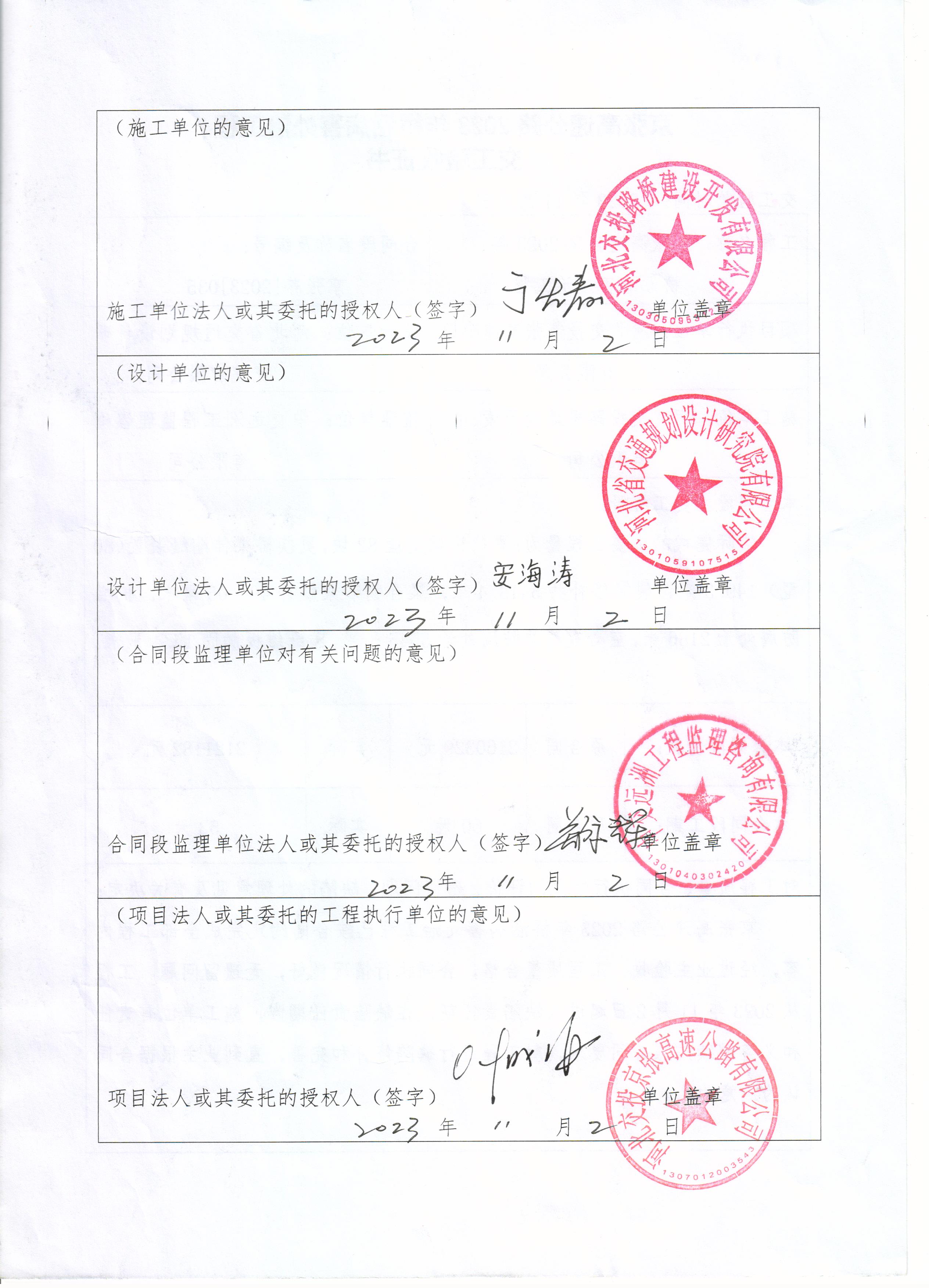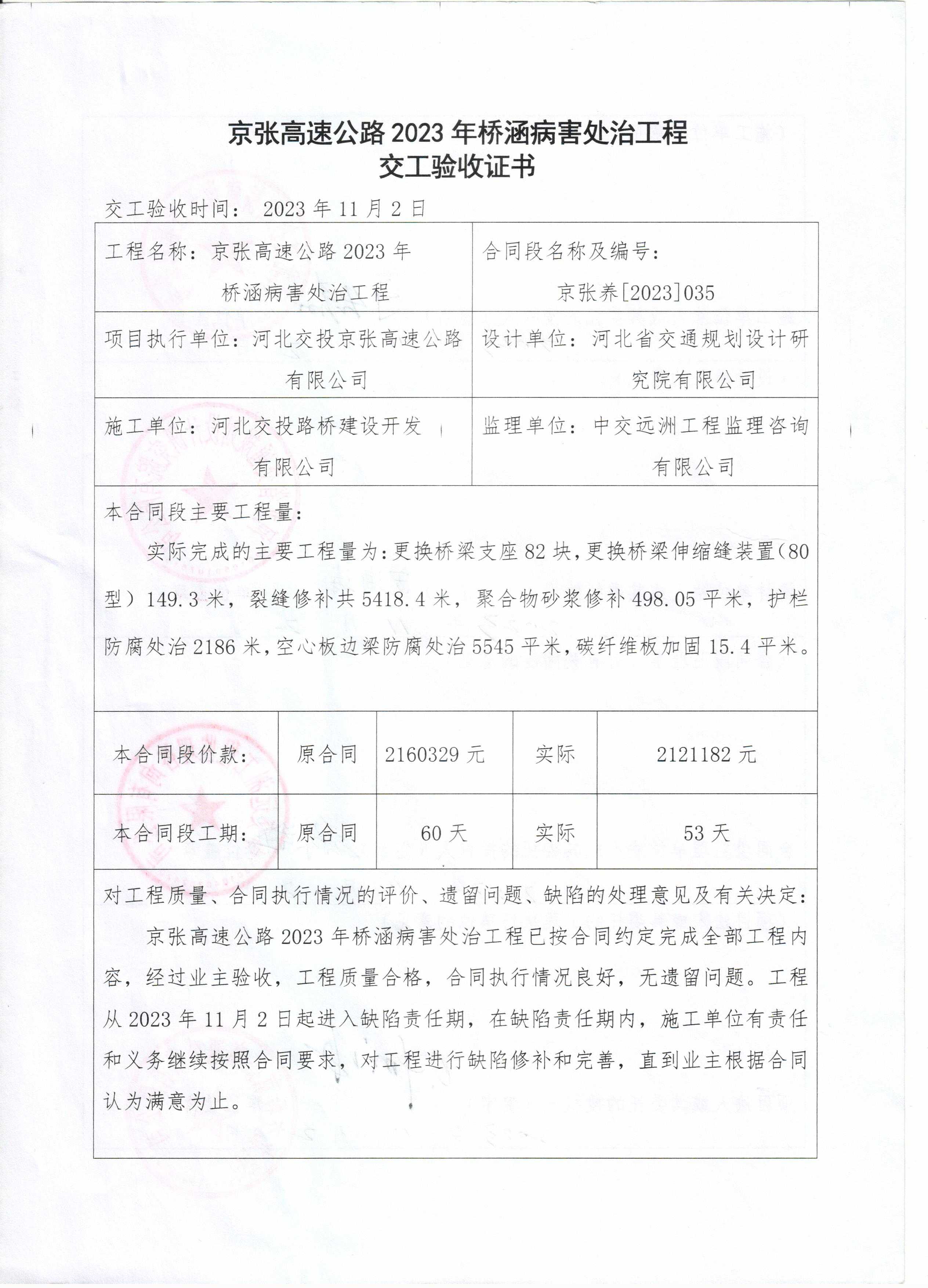 京張高速公路2023年橋涵病害處治工程交工驗(yàn)收證書